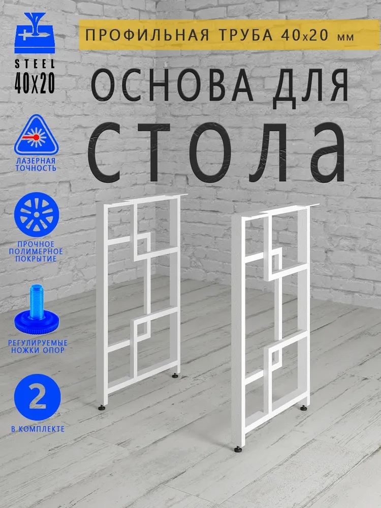 Это подстолье для стола в стиле лофт выполнено из прочного стального профиля 40х20 мм и покрыто порошковой краской в белый муар цвета RAL 9016. Габариты одной опоры - 735х450х40 мм. Ножки для стола служат для самостоятельной сборки мебели и создания интерьеров: на кухне и в гостиной, спальне и на балконе, беседке и на лоджии, кабинете или офисе, зоне барбекю, мангальной.