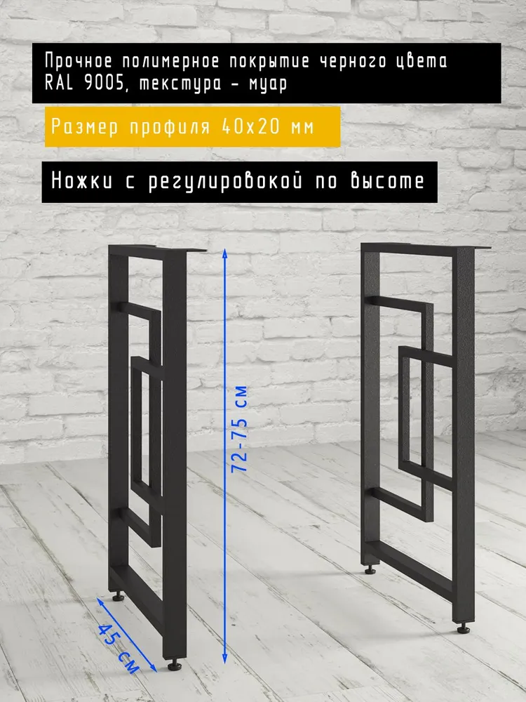 Стальные мебельные опоры для столаЭто подстолье для стола в стиле лофт выполнено из прочного стального профиля 40х20 мм и покрыто порошковой краской в черный муар цветом RAL 9005. Габариты опоры каждой опоры - 735х45х40 мм. Они служат для самостоятельной сборки мебели и создания интерьеров: на кухне и в гостиной, спальне и на балконе, беседке и на лоджии, кабинете или офисе, зоне барбекю, мангальной.