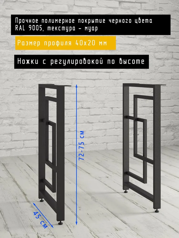 Стальные мебельные опоры для столаЭто подстолье для стола в стиле лофт выполнено из прочного стального профиля 40х20 мм и покрыто порошковой краской в черный муар цветом RAL 9005. Габариты опоры каждой опоры - 735х45х40 мм. Они служат для самостоятельной сборки мебели и создания интерьеров: на кухне и в гостиной, спальне и на балконе, беседке и на лоджии, кабинете или офисе, зоне барбекю, мангальной.