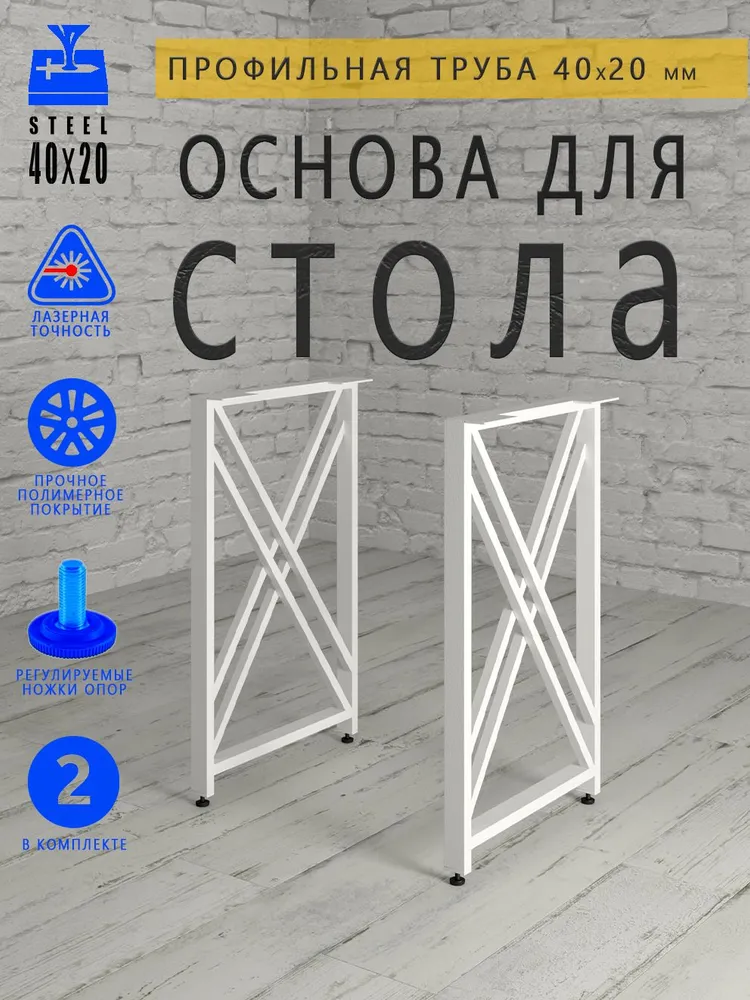Это подстолье для стола в стиле лофт выполнено из прочного стального профиля 40х20 мм и покрыто порошковой краской в белый муар цвета RAL 9016. Габариты одной опоры - 735х450х40 мм. Ножки для стола служат для самостоятельной сборки мебели и создания интерьеров: на кухне и в гостиной, спальне и на балконе, беседке и на лоджии, кабинете или офисе, зоне барбекю, мангальной.