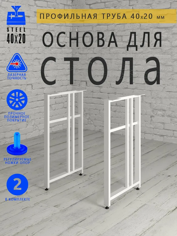 Это подстолье для стола в стиле лофт выполнено из прочного стального профиля 40х20 мм и покрыто порошковой краской в белый муар цвета RAL 9016. Габариты одной опоры - 735х450х40 мм. Ножки для стола служат для самостоятельной сборки мебели и создания интерьеров: на кухне и в гостиной, спальне и на балконе, беседке и на лоджии, кабинете или офисе, зоне барбекю, мангальной.