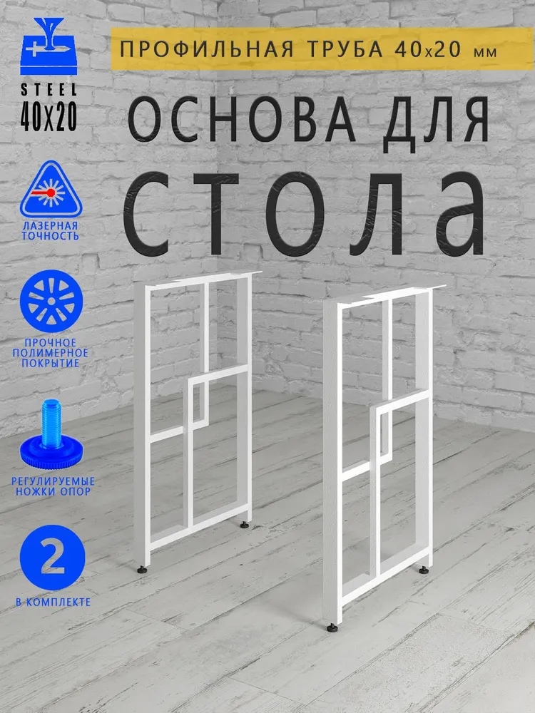Это подстолье для стола в стиле лофт выполнено из прочного стального профиля 40х20 мм и покрыто порошковой краской в белый муар цвета RAL 9016. Габариты одной опоры - 735х450х40 мм. Ножки для стола служат для самостоятельной сборки мебели и создания интерьеров: на кухне и в гостиной, спальне и на балконе, беседке и на лоджии, кабинете или офисе, зоне барбекю, мангальной.